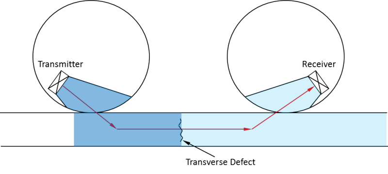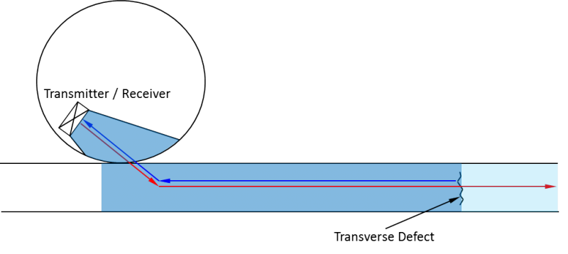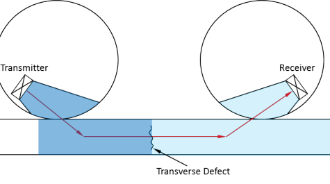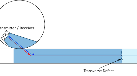 One of the most critical defects found in rail is the transverse defect, as they can lead to a rail break. Defects that develop in the transverse plane are normally internal in origin and not visible from the outside of the rail. Due to the fact that these defects are normal to the top of the head they are also difficult to detect with bulk wave ultrasound. Transverse defects also commonly occur under shelling which can make them more difficult to detect with bulk wave ultrasound. Guided waves traveling along the axis of the rail are traveling in the optimal direction to reflect off of and detect transverse defects as they are traveling normal to the defect plane. Guided waves also have the ability to propagate under shelling defects and still be sensitive to transverse defects. Guidedwave has patented technology which uses a guided wave wheel probe to detect transverse defects in both the head and the base of rail. Guidedwave is pleased to be working in conjunction with Olympus Scientific Solutions Americas and Nordco on this technology.
