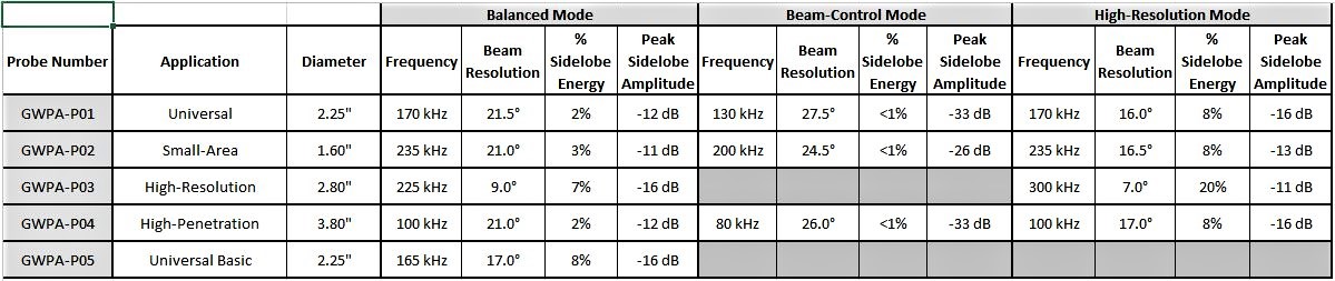 Guided wave phased array probes can be used in conjunction with the UltraWave LRT platform and guided wave phased array (GWPA) software to inspect large areas of plates and shells from a single probe position. These probes use multiple patent-pending technologies to generate radar-like scans in plates and shells. Beam steering algorithms are used to create a focal beam, which can be automatically swept around the plate to detect wall loss, cracks, and structural features. Rather than using a time-consuming C-scanner to inspect the structure, a rapid assessment can be performed from a single position with these probes.