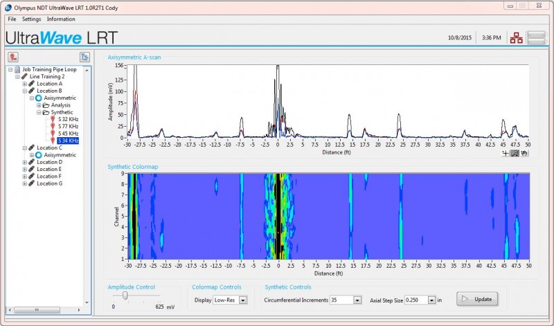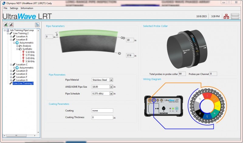 The UltraWave LRT software was designed specifically to simplify and optimize the real-world guided wave pipe inspection process and is compatible with piezoelectric and magnetostrictive long-range pipe inspection collars. The user-friendly software provides a step-by-step wizard for carrying out an inspection job and manages tasks from job creation, to pipe description, to data collection and management. An interactive tree control organizes the entire inspection job database. Enhanced flaw evaluation is possible with the active and synthetic focusing routines to characterize the circumferential extent and location of flaws and pipe features. A full suite of analysis tools including distance amplitude correction (DAC) curves and reflector annotations can be used for a detailed analysis. Report generation algorithms automatically compile all of the necessary inspection data into a single, easily-modified Microsoft Word document.