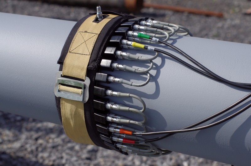 UltraWave piezoelectric pipe inspection collars are designed to be used in conjunction with the UltraWave LRT acquisition unit and software. These collars offer a low-profile, lightweight, ruggedized option for low-frequency, long-range pipe inspection with torsional guided waves. They have an operating frequency range of 15 to 85 kHz and are available in standard pipe sizes from 2″ to 36″ with custom options available for any pipe size.